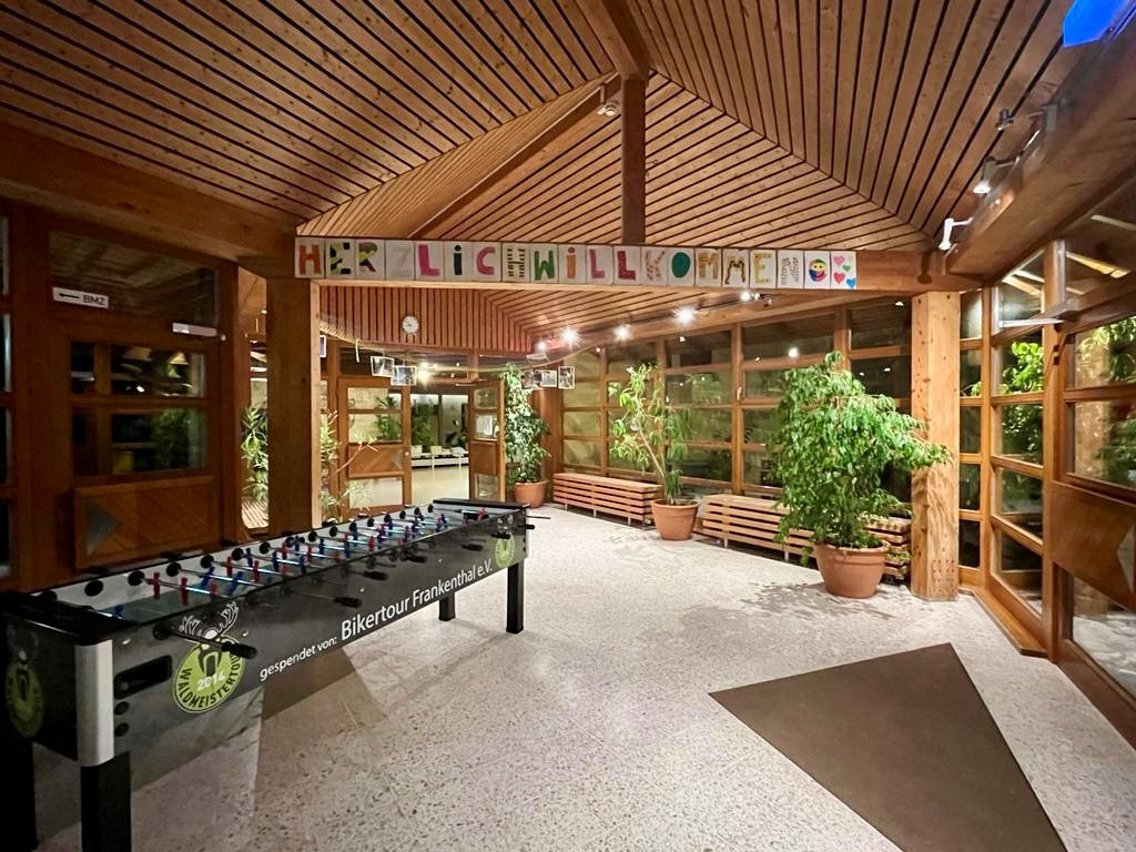 Ein riesiges Freigelände von über 15.000 qm bietet mit Sportplatz, Spielwiese Spielplatz, Kletterfelsen, Tipi und Wald viel Platz für vielfältigste Aktivitäten für den ganzen Tag. Im Haus selbst stehen XXL-Kicker und eine Tischtennisplatte zur Verfügung. |